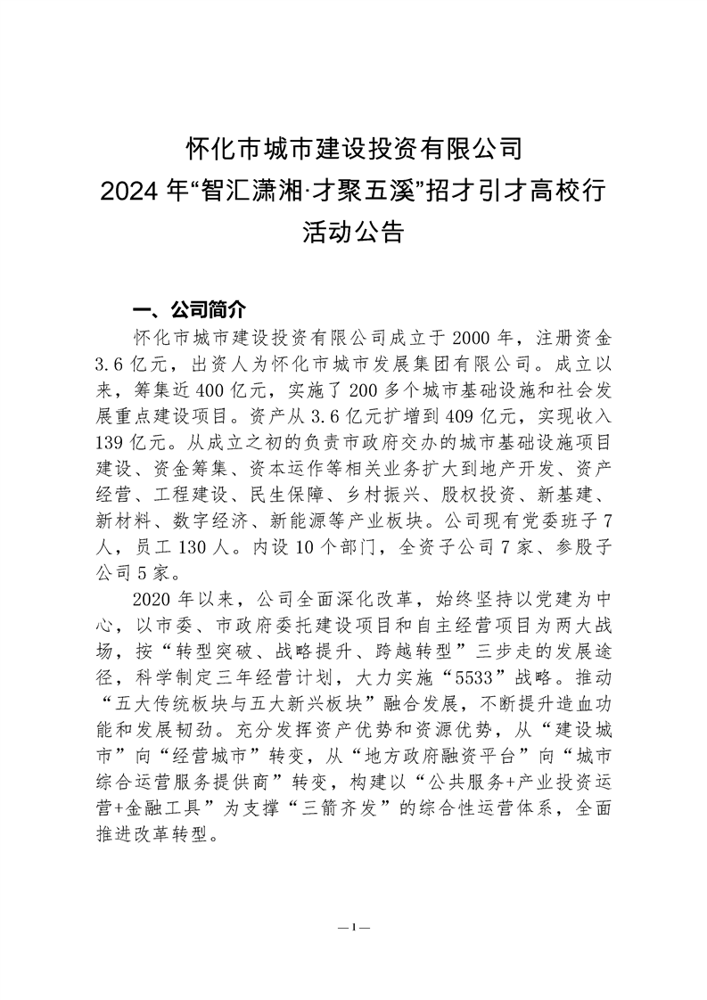懷化市城市建設投資有限公司2024年“智匯瀟湘·才聚五溪”招才引才高校行活動(dòng)公告