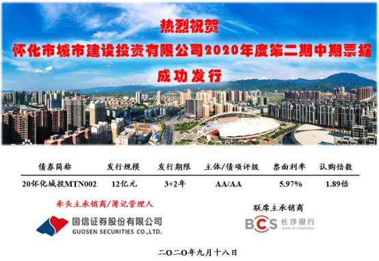 近日,懷化市城市建設投資有限公司在銀行間市場(chǎng)交易商協(xié)會(huì )成功發(fā)行2020年度第二期中期票據(簡(jiǎn)稱(chēng)“20懷化城投MTN002”),發(fā)行規模人民幣12億元,期限3+2年,票面利率5.97%。