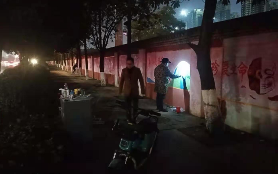 工人加班對圍墻進(jìn)行彩繪美化裝點(diǎn)