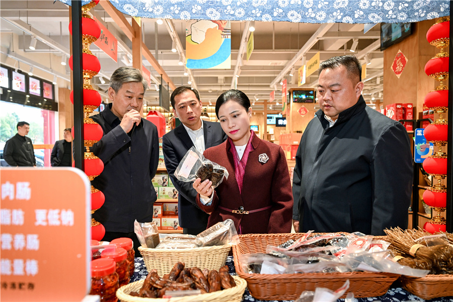 (1月9日下午,市委副書記、市長(zhǎng)韋朝暉在市文旅體育集團(tuán)、市農(nóng)林集團(tuán)調(diào)研。圖為韋朝暉在市農(nóng)林集團(tuán)“懷鄉(xiāng)懷品”總店詳細(xì)了解市場(chǎng)拓展等情況。懷化日?qǐng)?bào)全媒體記者 吳濤 攝)