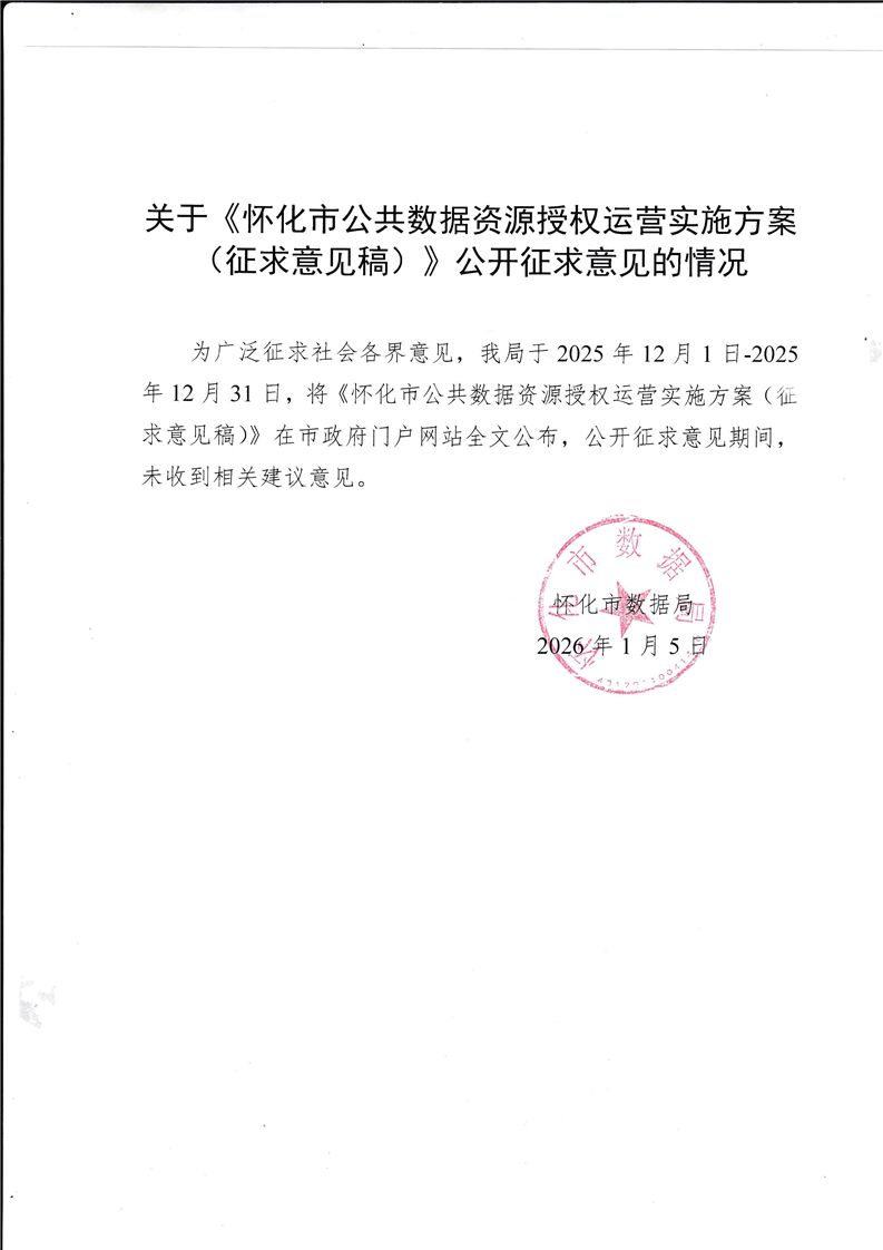 關(guān)于《懷化市公共數(shù)據(jù)資源授權(quán)運營實施方案(征求意見稿)》公開征求意見的情況