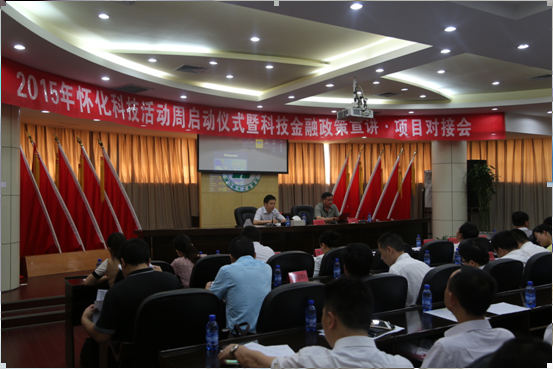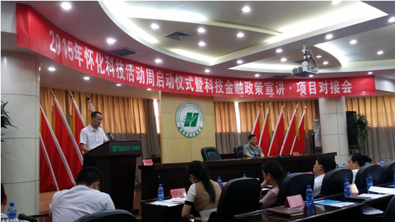 5月19日,2015年懷化科技活動(dòng)周啟動(dòng)式暨科技金融政策宣講·項(xiàng)目對(duì)接會(huì)在懷化工業(yè)園區(qū)舉行。來自懷化市直相關(guān)部門、各商業(yè)銀行、有關(guān)金融機(jī)構(gòu)、50多家科技型企業(yè),以及各縣市區(qū)科技局、經(jīng)信局和工業(yè)集中區(qū)管委會(huì)代表等150余人參加活動(dòng)。懷化市人民政府副市長楊開鳳宣布活動(dòng)正式啟動(dòng)。