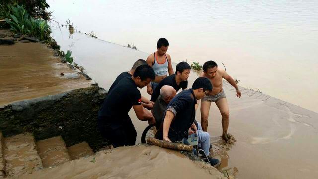 救援民警將寧鄉(xiāng)鋪村被困的癱瘓老人楊大爺安全轉(zhuǎn)移