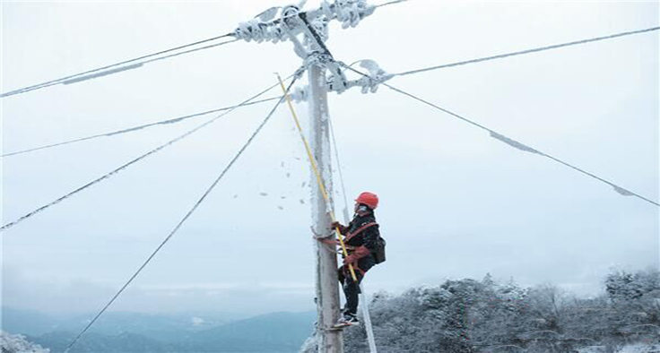 2018年12月31日上午10時(shí),國(guó)網(wǎng)芷江供電公司工作人員在海拔1008米的明山頂峰進(jìn)行上桿除冰作業(yè)。連日來,為保障人民群眾生產(chǎn)生活用電,該公司派出精干力量巡視129人次,特巡線路28條次,排除險(xiǎn)情47處。(郭志剛 龔衛(wèi)國(guó) 攝)