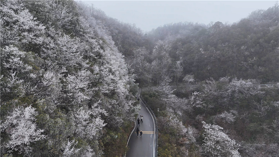 此次降雪后,索道沿線山林盡染素白,霧凇晶瑩,云海翻涌,游客乘索道凌空而行,30分鐘內(nèi)便可俯瞰層巒疊嶂間冰裹樹(shù)梢、雪覆梯田的奇景。尤其在清晨陽(yáng)光映照下,冰晶折射出璀璨光芒,仿若步入琉璃世界。