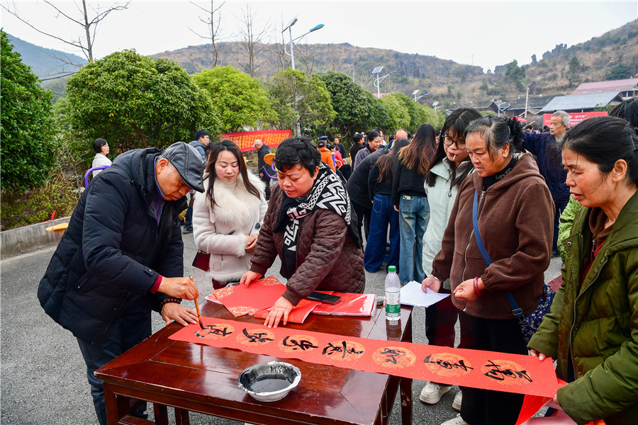 1月18日上午,“翰墨飄香迎新春 春聯(lián)福字送萬家”寫春聯(lián)送祝福活動在鶴城區(qū)黃巖旅游度假區(qū)舉行。書法家揮毫潑墨,游客即興創(chuàng)作,紅聯(lián)映云海,福字暖人心,山間年味滿溢。(懷化日報全媒體記者 潘雨 攝)