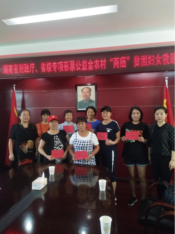 2019年上半年,懷化市共爭(zhēng)取到省級(jí)專項(xiàng)彩票公益金、農(nóng)村“兩癌”貧困婦女救助金32.4萬元,救助全市27名兩癌貧困患者,旨在幫助不幸患病的貧困婦女們能充分發(fā)揚(yáng)“自尊、自信、自立、自強(qiáng)”精神,積極樂觀面對(duì)生活,堅(jiān)強(qiáng)勇敢對(duì)抗病魔,把黨和政府的關(guān)愛化作戰(zhàn)勝疾病的力量,用頑強(qiáng)的意志創(chuàng)造美好燦爛的明天。(圖為8月28日,洪江市“兩癌”貧困婦女救助金發(fā)放現(xiàn)場(chǎng))