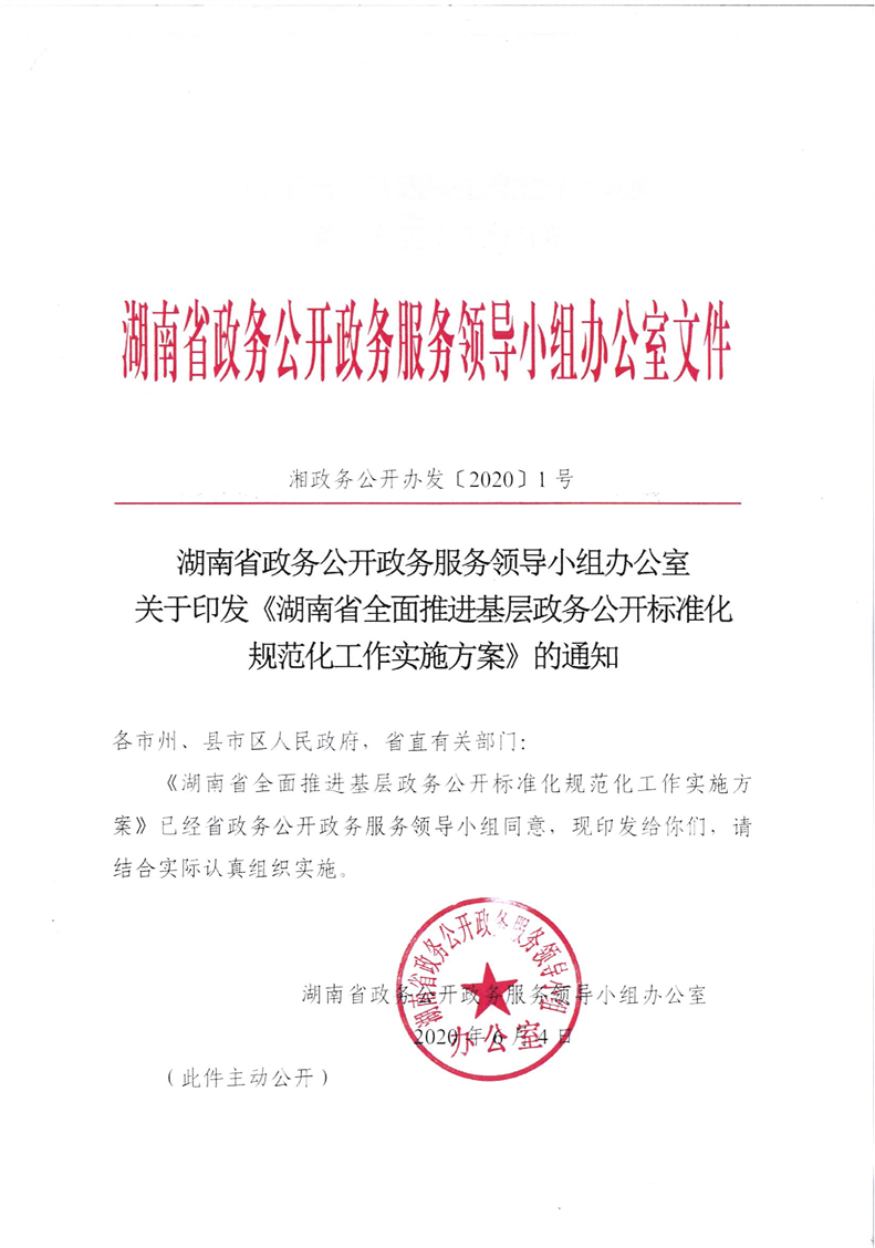 湖南省政務(wù)公開政務(wù)服務(wù)領(lǐng)導(dǎo)小組辦公室關(guān)于印發(fā)《湖南省全面推進基層政務(wù)公開標準化規(guī)范化工作實施方案》的通知(湘政務(wù)公開辦發(fā)〔2020〕1號)