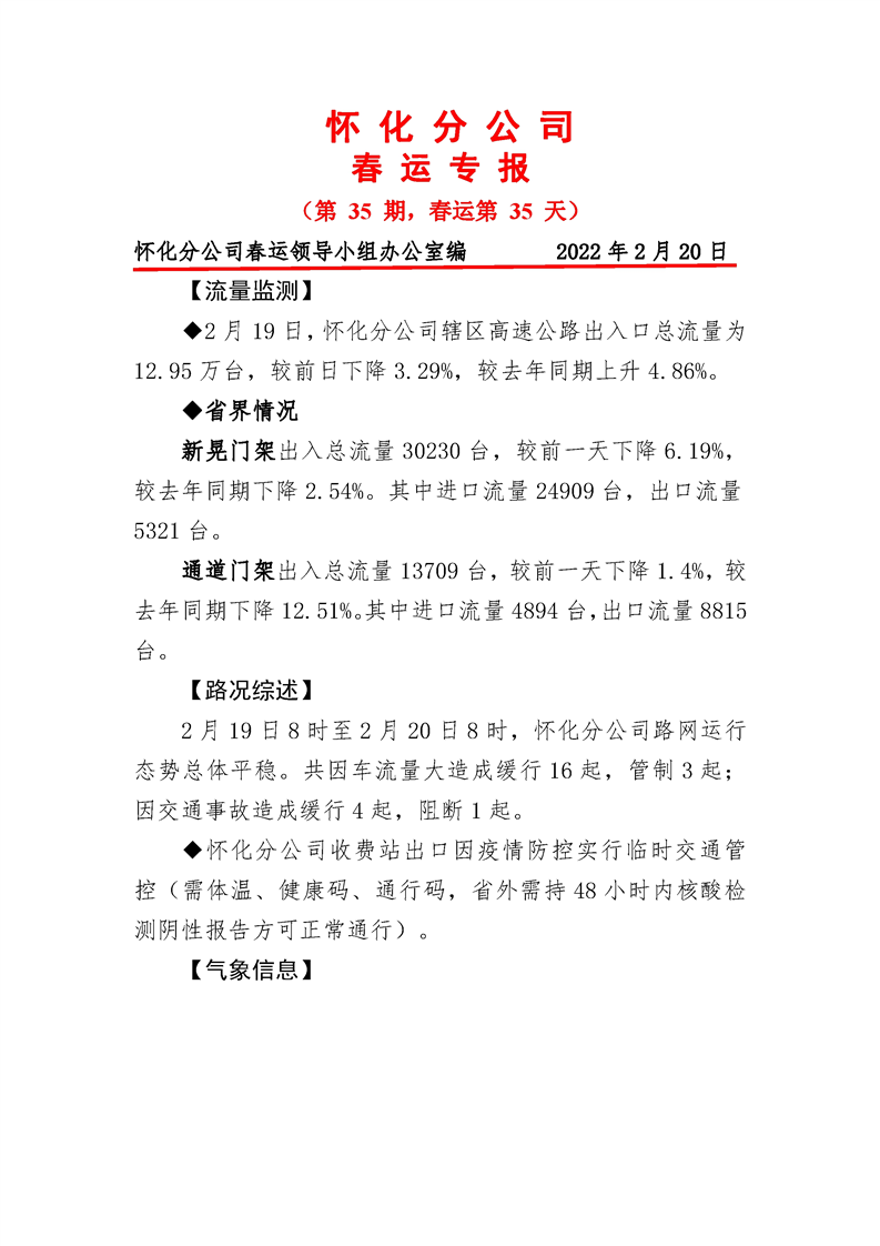 2022年高速懷化分公司第35期春運(yùn)專報(bào)
