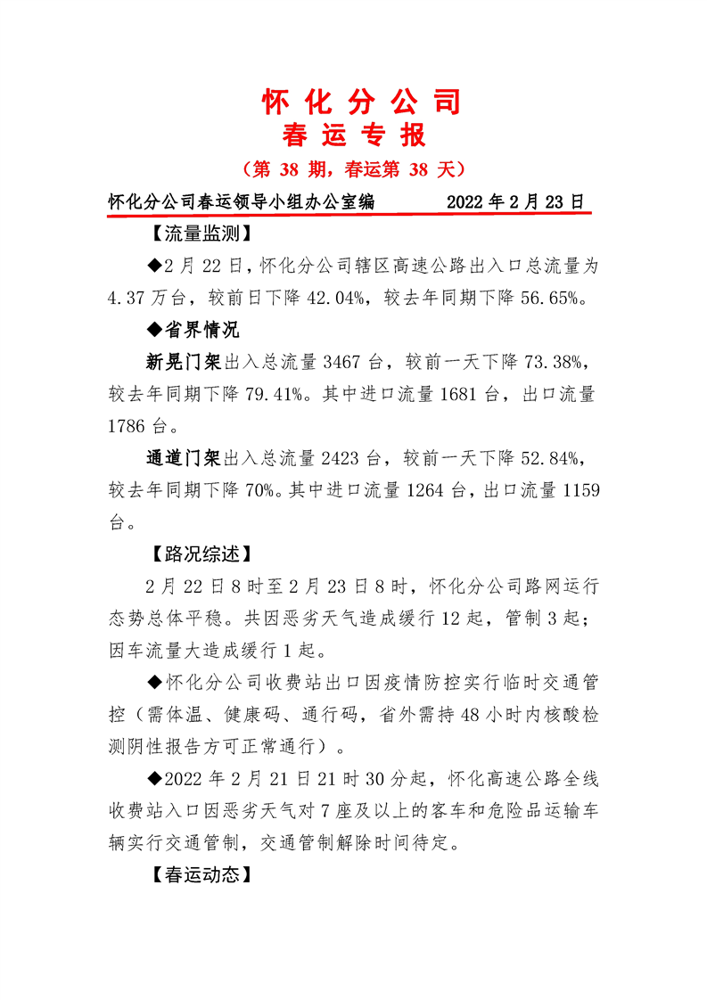 2022年高速懷化分公司第38期春運(yùn)專報(bào)