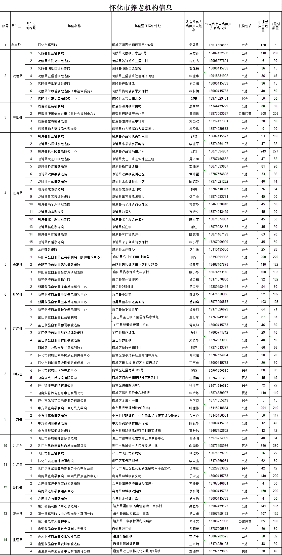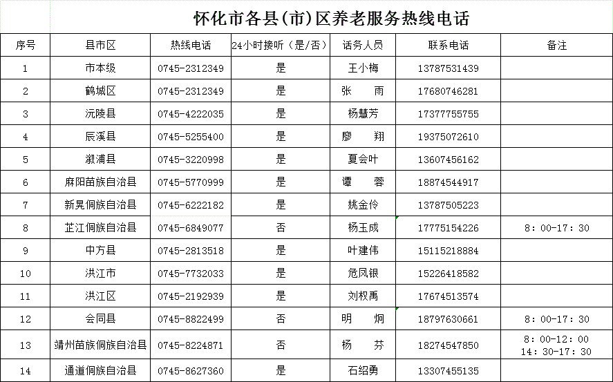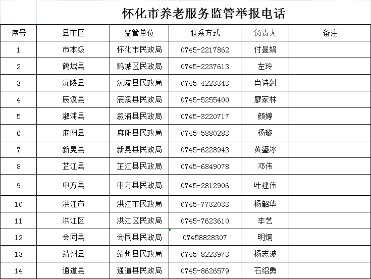 為響應(yīng)社會(huì)為老服務(wù)需求,提升養(yǎng)老服務(wù)質(zhì)量,加強(qiáng)對(duì)養(yǎng)老機(jī)構(gòu)和養(yǎng)老從業(yè)人員的監(jiān)督,回應(yīng)民眾關(guān)切,推動(dòng)養(yǎng)老事業(yè)和養(yǎng)老產(chǎn)業(yè)協(xié)同健康發(fā)展,經(jīng)市縣民政部門確認(rèn),現(xiàn)將懷化市縣兩級(jí)養(yǎng)老服務(wù)熱線和監(jiān)管舉報(bào)電話,在懷化轄區(qū)內(nèi)依法辦理法人登記并在民政部門備案且通過消防審驗(yàn)的養(yǎng)老機(jī)構(gòu)名單予以公布并接受社會(huì)各界的監(jiān)督。