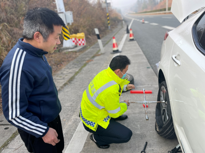 春運第一天,高速公路上車流量明顯增加,懷化西管理所巡查人員江揚、于楓起了個大早,開始了一天的巡查工作。9時許,巡查至G65包茂高速懷化段K2187南往北時,發(fā)現(xiàn)一輛小車因右后輪爆胎停在緊急停車帶。由于駕駛員沒有換胎經(jīng)驗,正焦急地站在車旁,手足無措。巡查人員了解情況后,立即用隨車維修工具幫助司機更換輪胎,不到5分鐘就將備胎換上,幫助駕駛員再次踏上旅途。