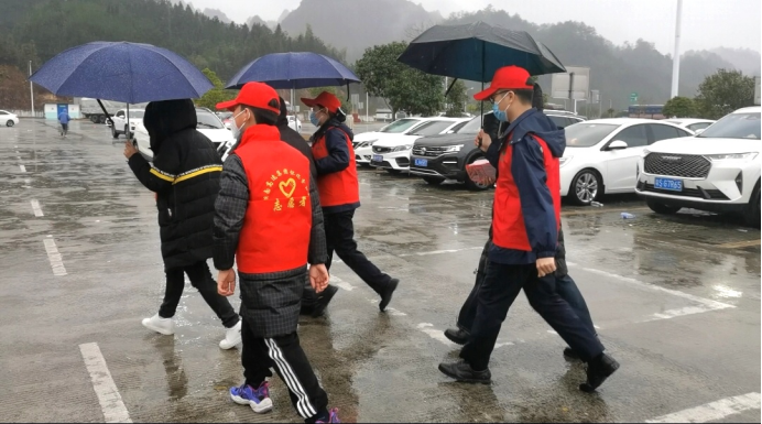 無獨(dú)有偶,在通道服務(wù)區(qū),一把把“暖心傘”撐起了這風(fēng)雪旅途上的“晴天”。這次雨雪來得突然,很多司乘車上都沒有帶雨具,在停車區(qū)下車后只能淋雨前往綜合區(qū)?!奥窡簟敝驹刚吡私馇闆r后,主動(dòng)為每一位司乘撐起暖心傘,在停車區(qū)和綜合區(qū)之間“迎來送往”。 同時(shí),“路燈”志愿者還為司乘提供指引路線、指揮車輛、發(fā)放健康包、送姜茶等服務(wù),暖心的服務(wù)得到司乘的一致好評(píng)。