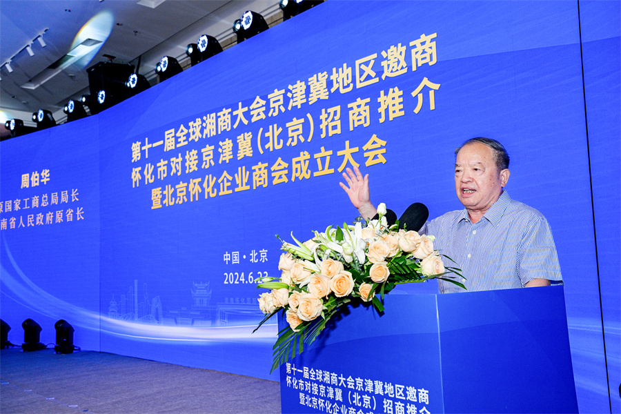 6月23日下午,第十一屆全球湘商大會(huì)京津冀地區(qū)邀商、懷化市對(duì)接京津冀(北京)招商推介暨北京懷化企業(yè)商會(huì)成立大會(huì)在北京舉行。圖為原國家工商總局局長、湖南省政府原省長周伯華出席并講話。(懷化日?qǐng)?bào)全媒體記者 潘雨 攝)