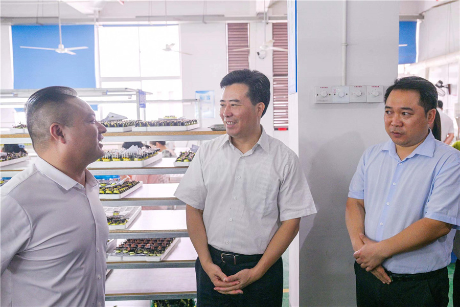 9月12日上午,市委副書記、市長(zhǎng)黎春秋在鶴城區(qū)調(diào)研企業(yè)穩(wěn)崗擴(kuò)崗促就業(yè)工作。圖為黎春秋在懷化海紅盛電子科技有限公司調(diào)研。(懷化日?qǐng)?bào)全媒體記者 潘雨 攝)