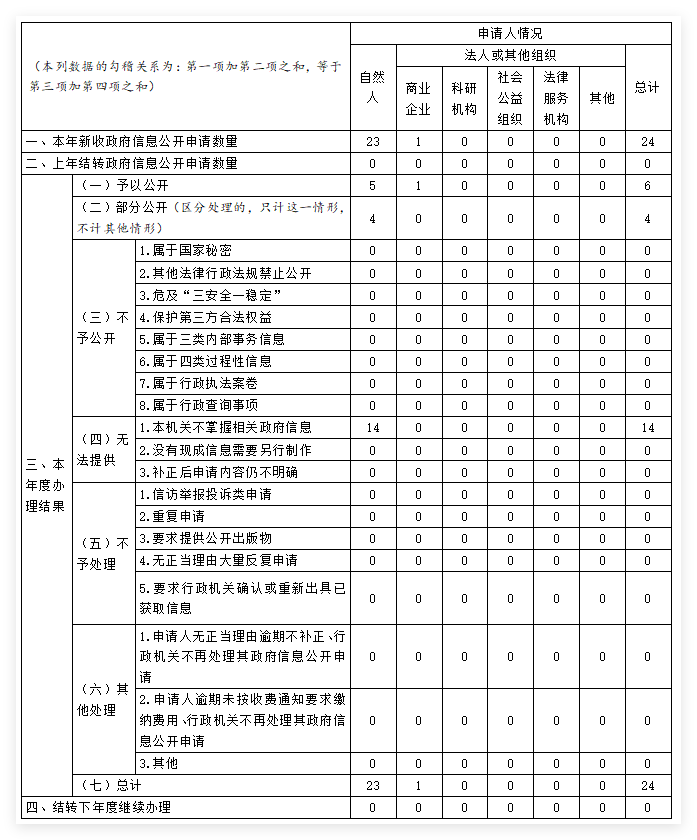 本年度報告根據(jù)《中華人民共和國政府信息公開條例》(以下簡稱《條例》)、湖南省政務(wù)公開領(lǐng)導(dǎo)小組辦公室《關(guān)于貫徹落實(中華人民共和國政府信息公開條例)實施方案》(以下簡稱《實施方案》)及《懷化市政府信息公開實施細(xì)則》(以下簡稱《細(xì)則》)的有關(guān)規(guī)定,由鶴城區(qū)政務(wù)公開領(lǐng)導(dǎo)小組辦公室編制。全文由總體情況、主動公開政府信息情況、收到和處理政府信息公開申請情況、政府信息公開行政復(fù)議行政訴訟情況、存在的主要問題及改進措施、其他需要報告的事項等六部分組成。本報告的統(tǒng)計數(shù)據(jù)時限為2024年1月1日至12月31日,通過懷化市鶴城區(qū)人民政府門戶網(wǎng)站對外公布。如對報告有任何疑問、意見,請與懷化市鶴城區(qū)政務(wù)服務(wù)中心聯(lián)系(地址:懷化市鶴城區(qū)政務(wù)服務(wù)中心五樓501室,郵編:418000,電話:0745-2338221,電子郵箱:hcqzwzx@126.com)。