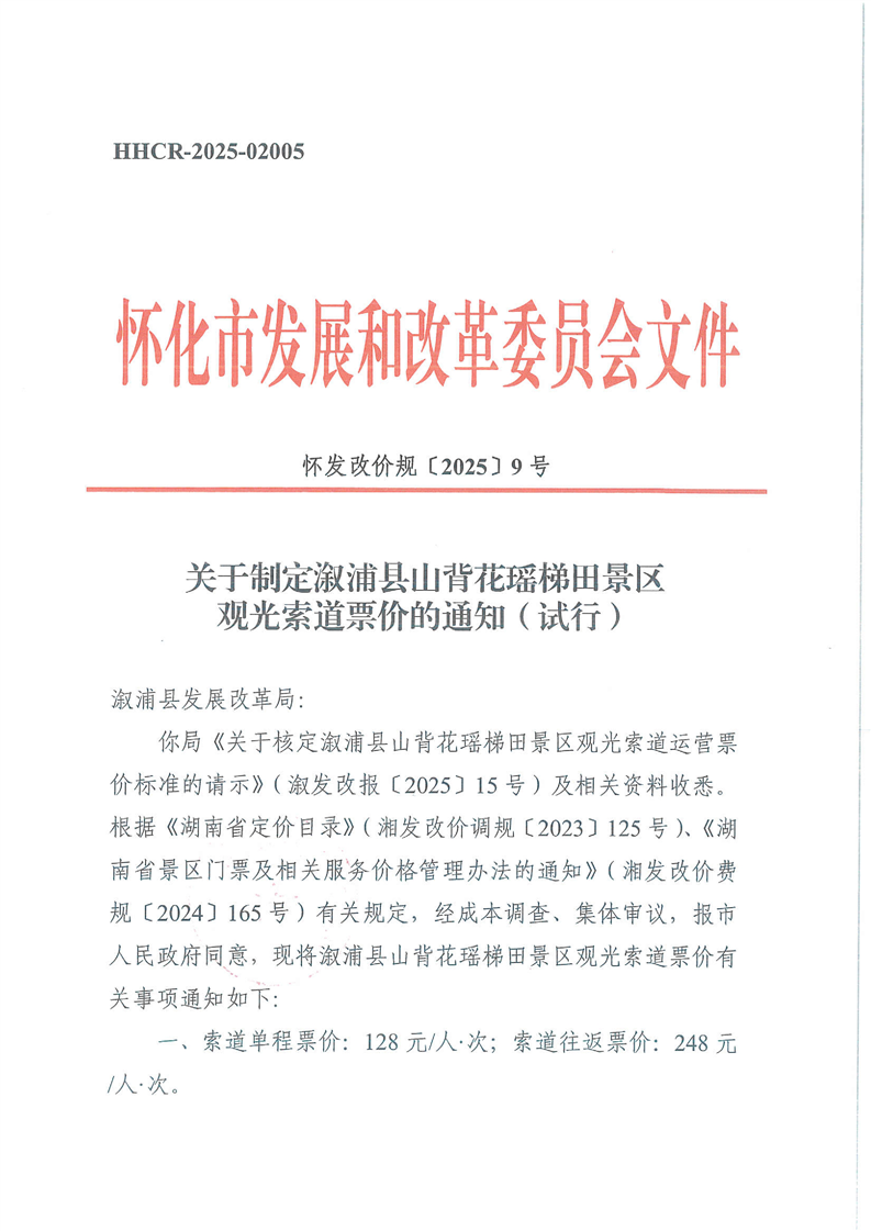 關(guān)于制定溆浦縣山背花瑤梯田景區(qū)觀光索道票價(jià)的通知(試行)